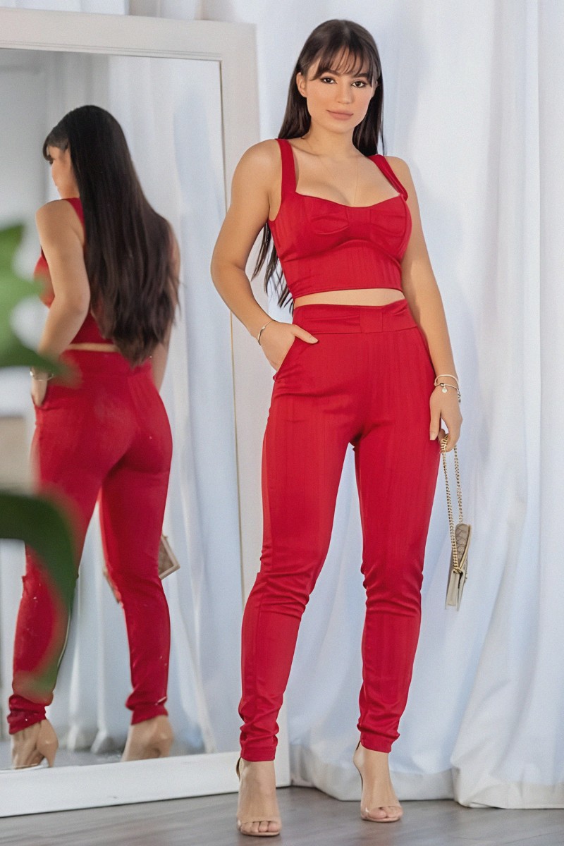 A tonalidade vinho adiciona um toque de glamour, enquanto a bandagem confere um ajuste confortável e elegante. A calça larga proporciona movimento e estilo, tornando este conjunto adequado para diversas ocasiões, desde encontros casuais até eventos mais formais.