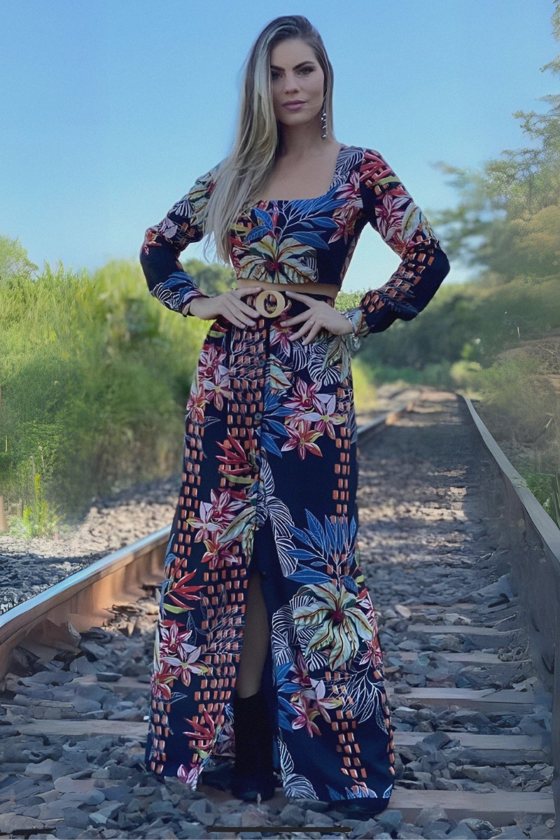 Estampa Vibrante e Moderna: A saia e o cropped apresentam uma estampa vibrante que é uma verdadeira obra de arte. As cores ricas e o design contemporâneo criam um visual dinâmico e cativante, perfeito para mulheres que desejam expressar sua individualidade com confiança.